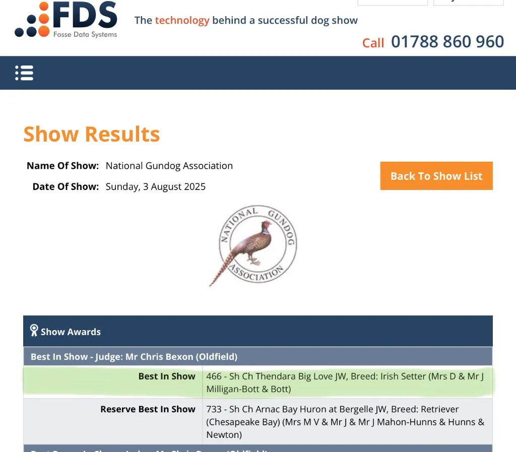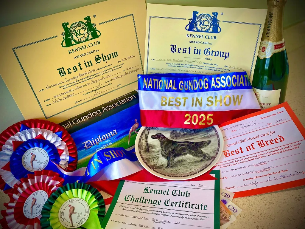 Over the past 4 decades our small kennel has enjoyed some very memorable and fine success at the highest levels but for our youngest champion ‘Thendara Big Love’ to be awarded ‘BEST IN SHOW’ At the most revered ‘National Gundog Association’ by Mr.Chris Bexon, one of our most qualified & respected Gundog specialists has left us absolutely delighted with very very proud memories which will last a lifetime.