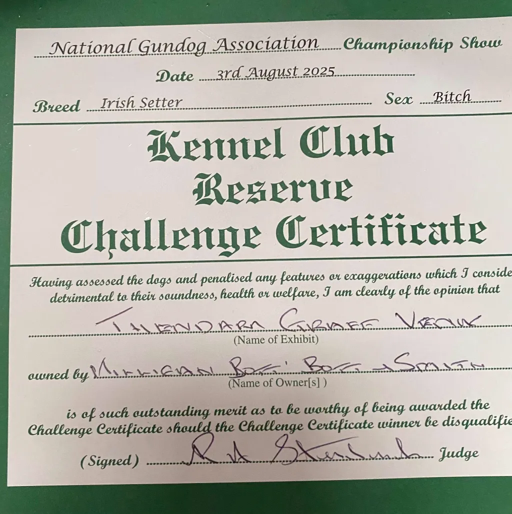 Earlier in the day we were thrilled when Sarah’s Rudy & Dena’s Haribo stood 1 & 2 in Junior dog, then our’s & Jo’s exciting young lady ‘Thendara Graff Venus’ continued her winning ways winning her first P.Grad class & the res.CC under gundog specialist Ray Strudwick.